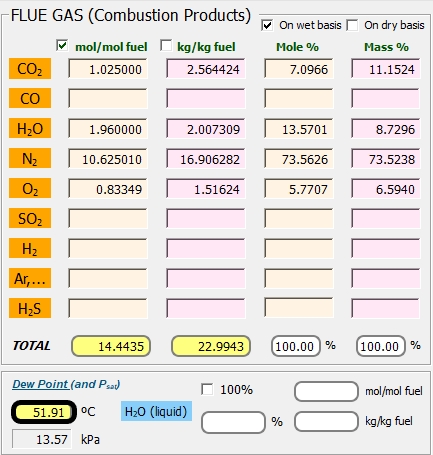 El punto de rocío de los gases de combustión, que es la temperatura a la que el vapor de agua comienza a condensarse, es un factor limitante de la cantidad de calor eliminado como energía útil. Cualquier enfriamiento adicional más allá de este punto causará graves problemas de corrosión, así como una reducción razonable del valor de tiro; un asunto que reducirá la eficiencia general del sistema (horno o generador de vapor). Se observa, que el punto de rocío para este caso es alrededor de 52 ºC.