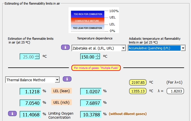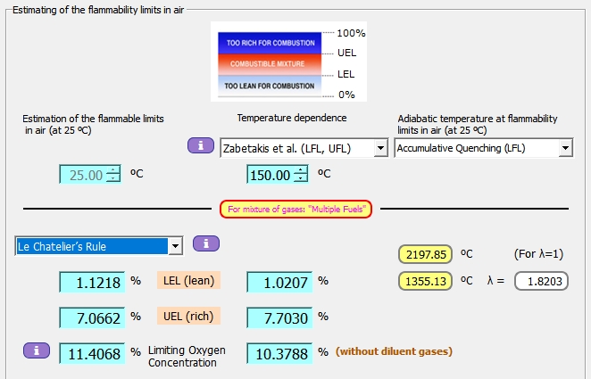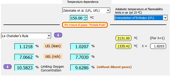 El enfoque clásico para combustibles múltiples con al menos un diluyente en el aire es agrupar el combustible/diluyente en un pseudocombustible y luego aplicar el principio de Le Chatelier para encontrar el estado inflamable de las mezclas.