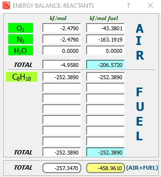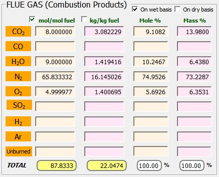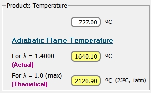 Se pueden repetir estos cálculos para un aire precalentado a 700 K. La temperatura de la llama adiabática del sistema abierto es de aproximadamente 2200 K, que es unos 300 K más alta que 1910 K cuando se utiliza aire a 298 K. Si el precalentamiento necesario para calentar el aire secundario es suministrado por los productos de combustión a 2200 K, entonces la temperatura de los productos de combustión desciende a 1910 K. En otras palabras, si se hace un seguimiento de la temperatura en un sistema de este tipo, ésta subirá gradualmente de 298 K a 2200 K (con una entalpía superior al valor convencional sin precalentamiento) durante un proceso adiabático y disminuirá 1910 K una vez que se elimine el calor para precalentar el aire de combustión. Este esquema se denomina combustión por exceso de entalpía (EEC), que es útil para los combustibles especialmente de bajo poder calorífico o para la combustión que implique un gran exceso de aire con el fin de estabilizar la llama. En cambio, si se quiere mantener una temperatura de 1910 K sin precalentamiento, hay que reducir la concentración de oxígeno, como se hace en los sistemas de combustión de aire a alta temperatura.