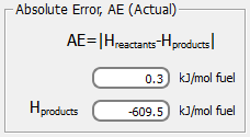 ΔU0 - ΔH0 = 6.6895 kJ/mol fuel (esta diferencia es despreciable). Se observa que si hubiera exceso de aire, el resultado permanece invariable, ya que aumenta la misma cantidad de O2 y N2 como reactivos y como productos.