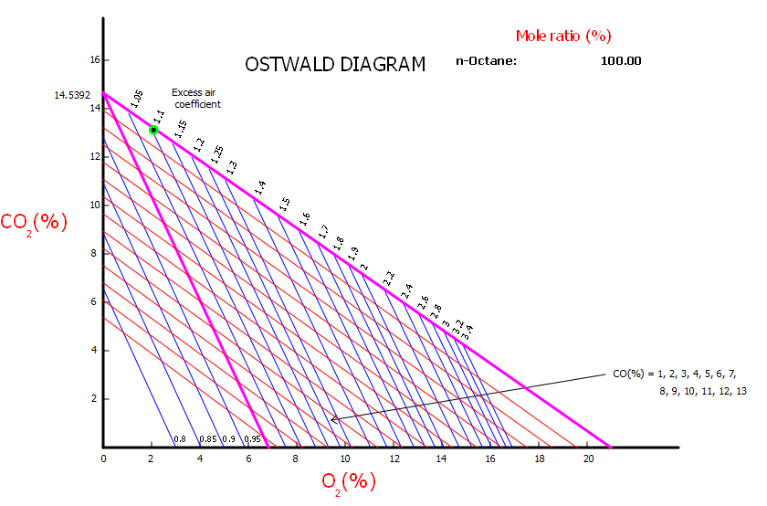 Se trata de un diagrama de productos de combustión (CO2, CO y O2) en base seca en función del coeficiente de exceso de aire y sin tener en cuenta el H2.