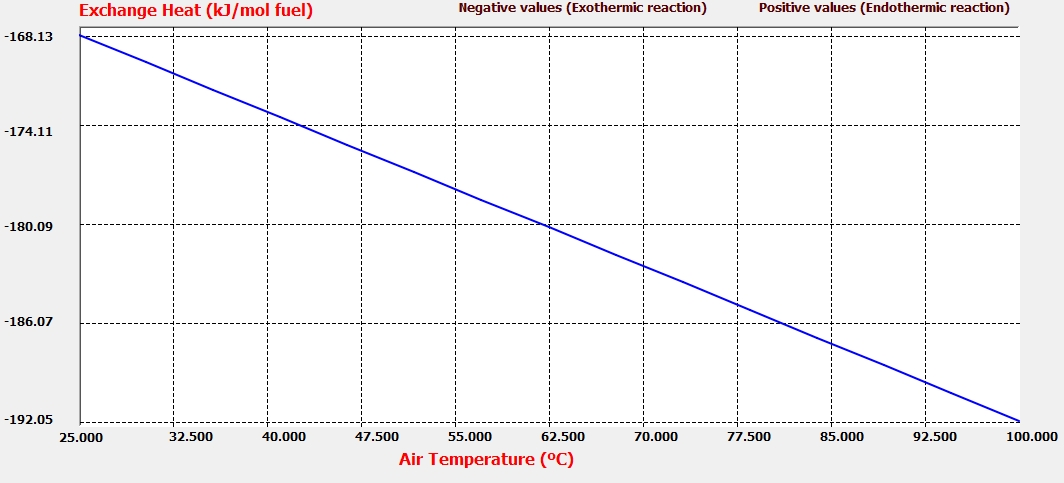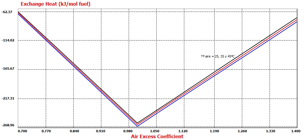 Como era de esperar, al aumentar la temperatura del aire a la entrada del proceso de combustión, aumenta la entalpía de los reactivos, aumentando la diferencia de entalpía entre los reactivos y productos de combustión, incrementándose levemente el calor intercambiado.