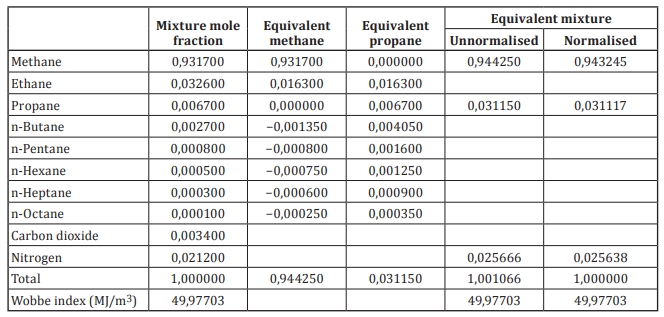Para las mezclas que cumplen con el requisito de contenido de hidrógeno de las Regulaciones de seguridad (gestión) de gas del Reino Unido, la intercambiabilidad se puede mostrar visualmente en un gráfico del índice de Wobbe y la suma de las fracciones molares de propano y nitrógeno en la mezcla equivalente. Esto se muestra en la figura siguiente. La mezcla de ejemplo se encuentra dentro del área permitida para el funcionamiento normal y, por lo tanto, es intercambiable. En la práctica, el cumplimiento de los requisitos se evalúa numéricamente utilizando los criterios de límite anteriores.