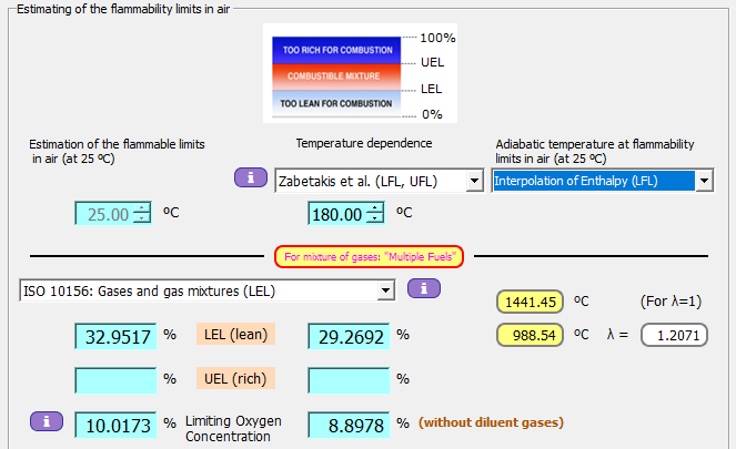 Empíricamente, se supone que la dependencia de la temperatura es lineal y se expresa como el porcentaje de caída por cada 100 ºC de caída de temperatura. Zabetakis y col. han descubierto que los límites inferiores de los hidrocarburos disminuyen linealmente en aproximadamente un 8 % para un aumento de temperatura de 100 °C. Esto es consistente con la disminución del aumento de entalpía neta del aire de fondo.