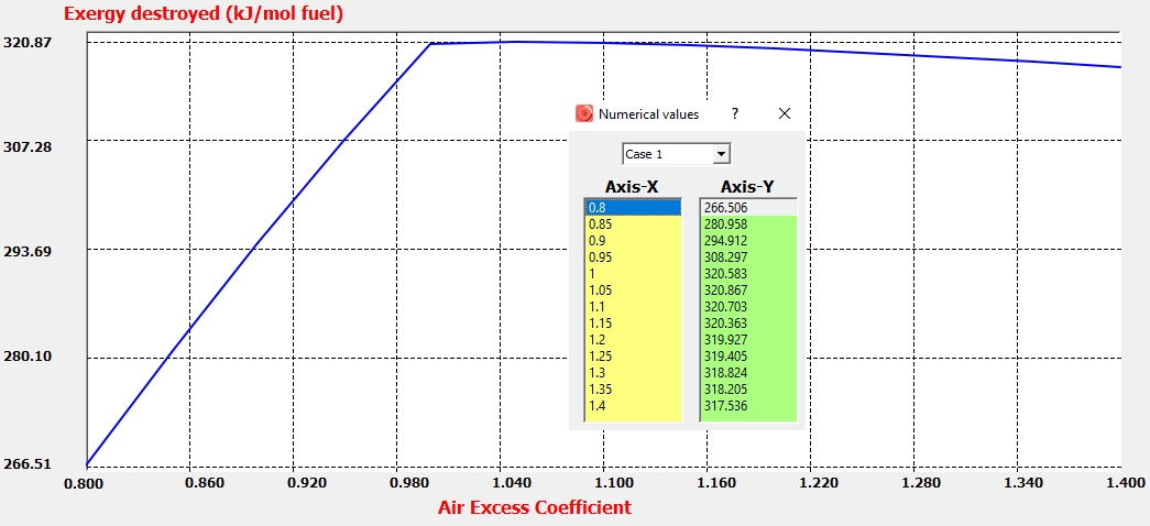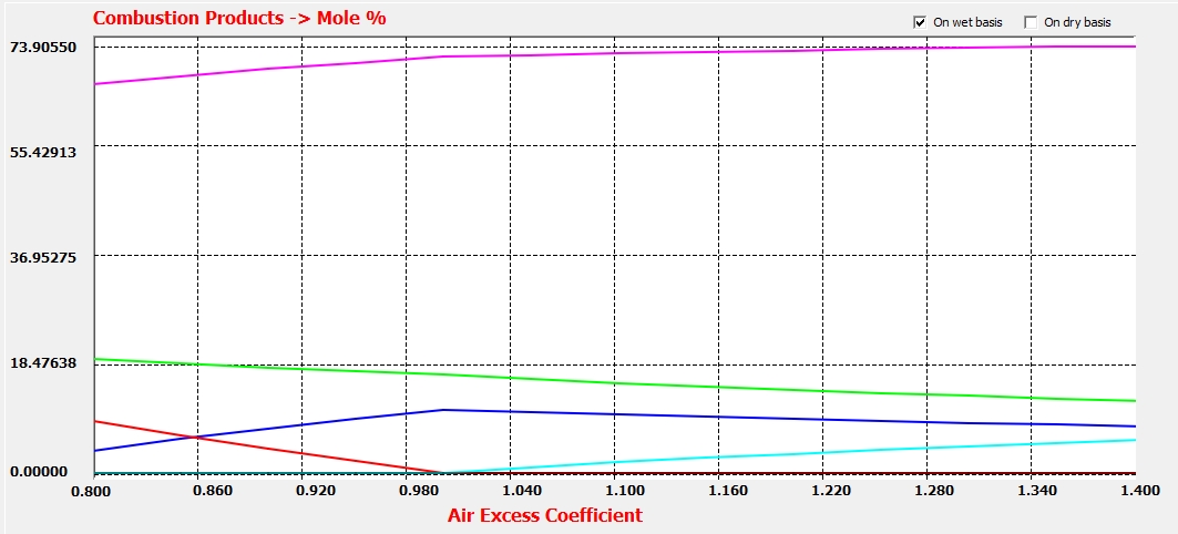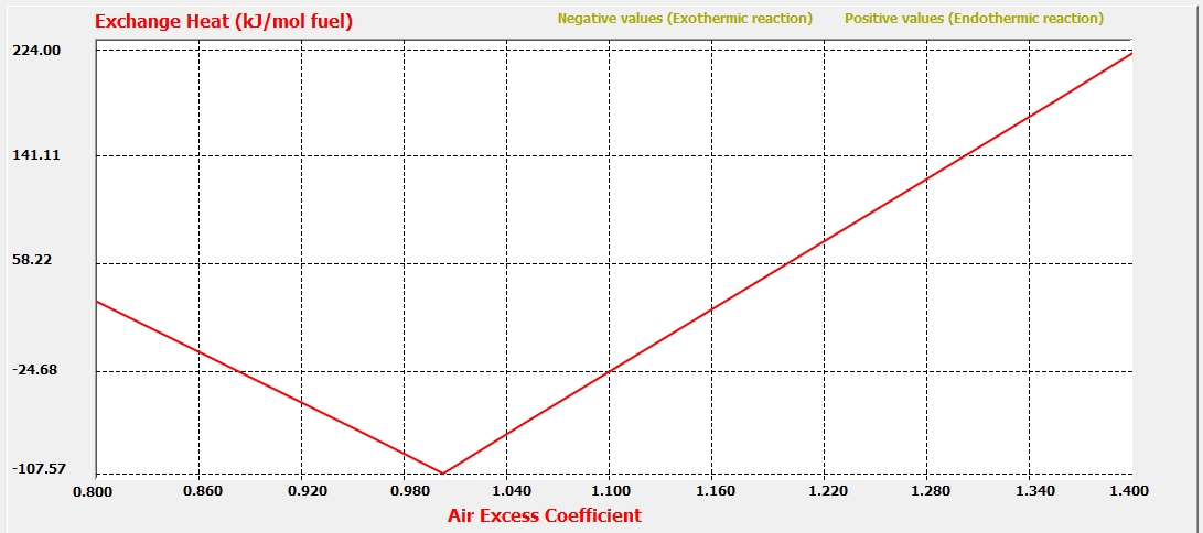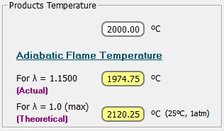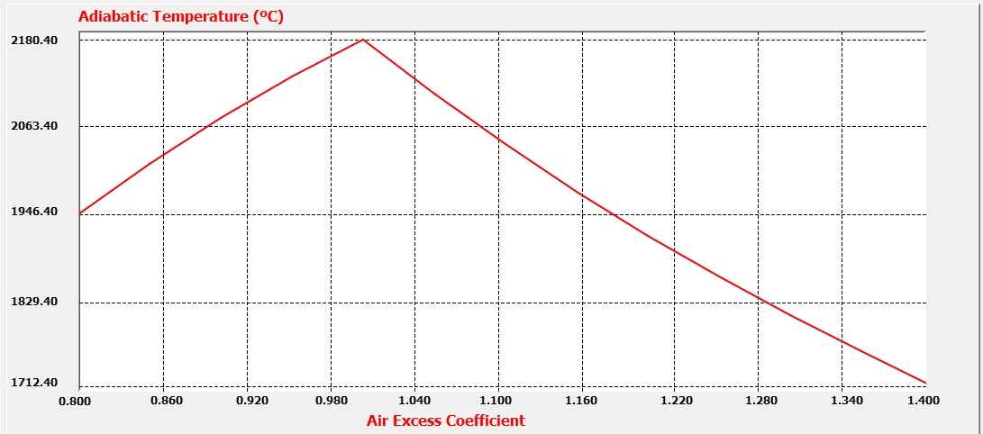 Observamos que en este último caso el proceso de combustión se vuelve endotérmico, por lo que habría que aportar energía al proceso de combustión. Además, como era de esperar también, se observa que la disminución del exceso de aire provoca una disminución de la temperatura adiabática de los productos.