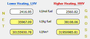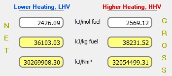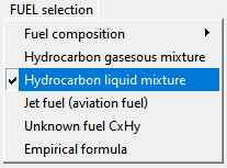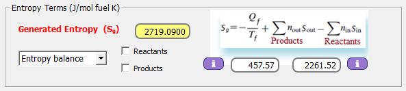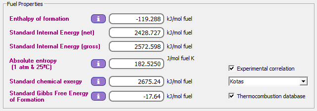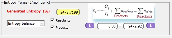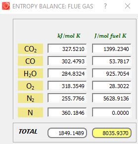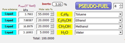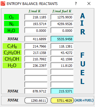 Para el cálculo de las entropías de las sustancias que componen la mezcla del hidrocarburo en estado líquido, se emplea la Ley de Raoult, donde la presión total del combustible es el sumatorio de todas las presiones parciales (producto de la presión de vapor por la fracción molar de cada sustancia). La presión total del combustible es calculada, en este caso, por THERMOCombustion.