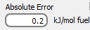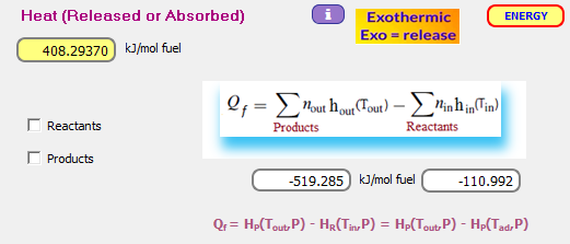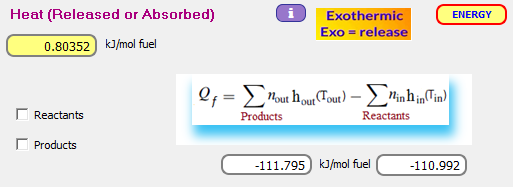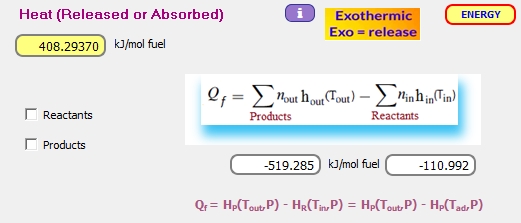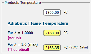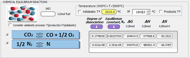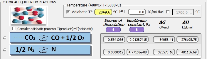 Marcando la opción "Adiabatic Tª", el software obtiene la temperatura adiabática de la llama, 2049.6ºC, inferior como era de esperar a la temperatura adiabática sin disociación química. El menú de salida muestra también el error absoluto en kJ/kmol fuel en esta estimación, en referencia al balance energético del proceso reactivo asociado a reacciones de equilibrio químico.