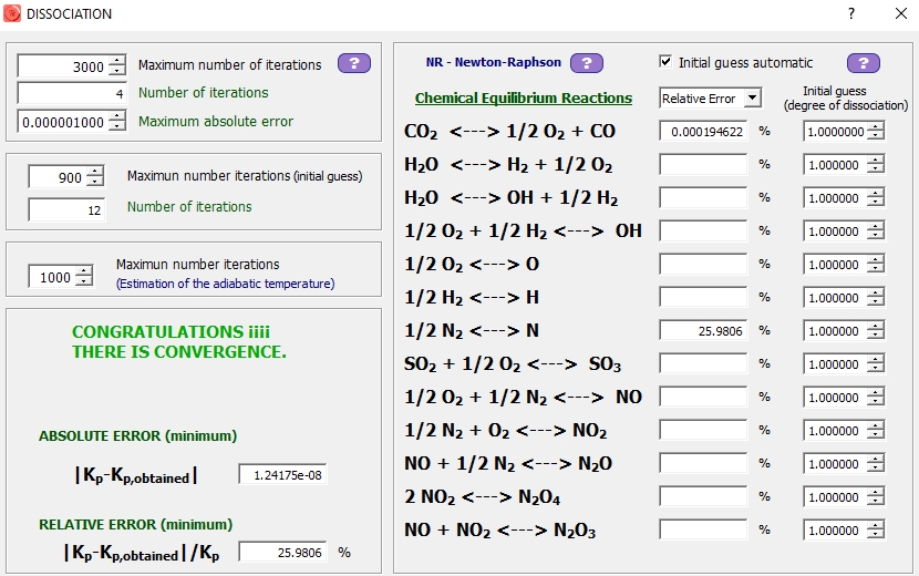 El siguiente menú muestra el error obtenido en la estimación del grado de disociación de la reacción química que se resuelve mediante Newton-Raphson. Es posible disminuir o aumentar la exigencia en el error absoluto máximo requerido, siendo por defecto de 10^-6^.