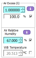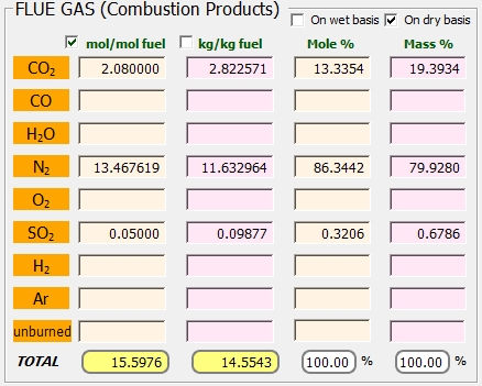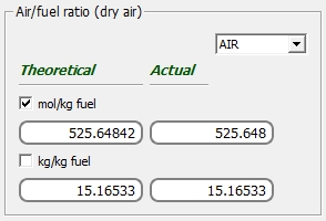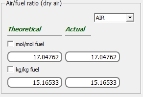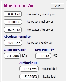 El aire modelizado como aire húmedo (HR=67%) presenta una mayor cantidad de productos de combustión (18.8675 moles/mol combustible, frente a 18.4976 moles/mol combustible). Permanece invariable la relación aire/combustible.