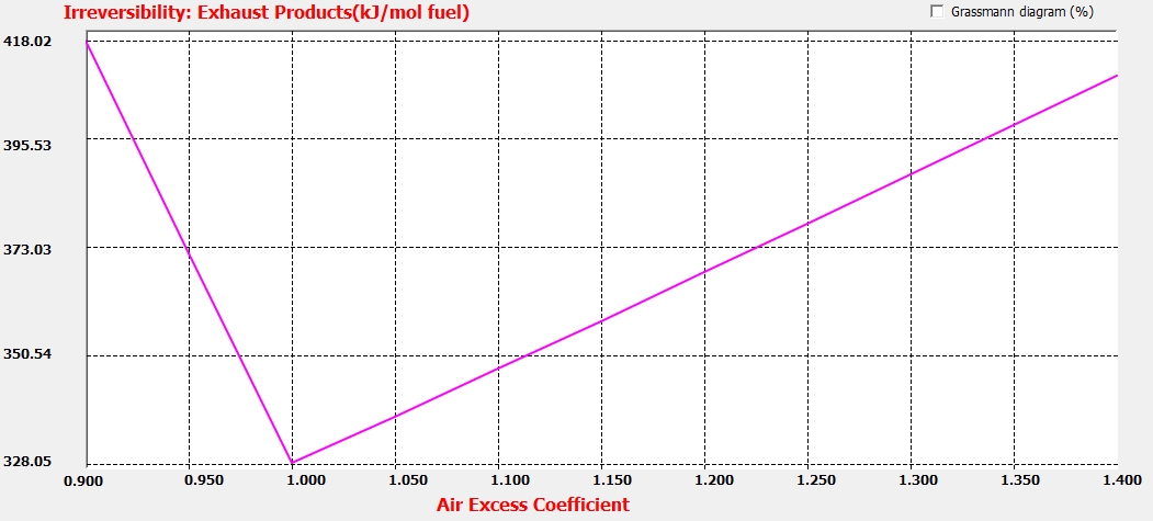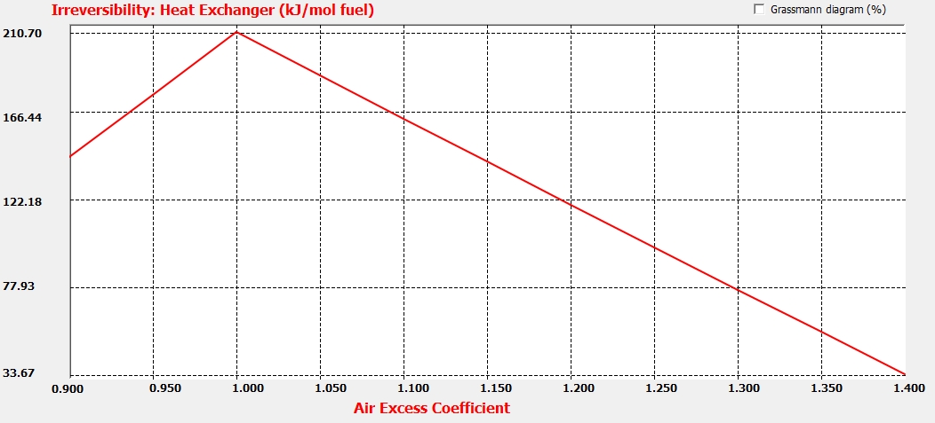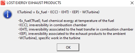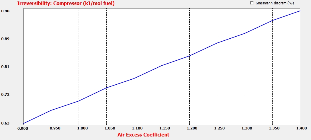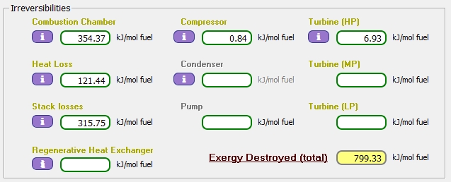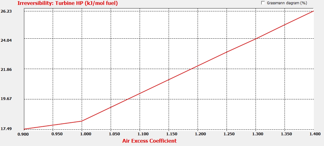 La temperatura de los gases de escape decrece fuertemente, con lo que se consigue un mejor aprovechamiento de la exergía química del combustible, mejorando la eficiencia exergética (29.70%), decayendo las pérdidas por irreversibilidades en la turbina y disminuyendo también las pérdidas por irreversibilidades debida a los productos de combustión expulsados al ambiente.