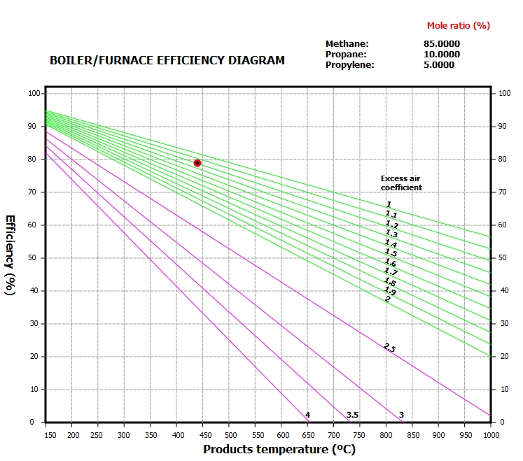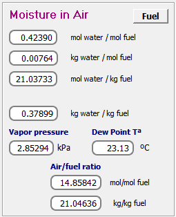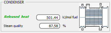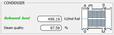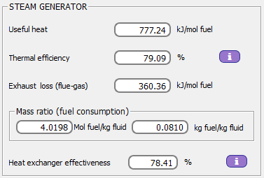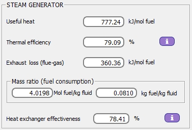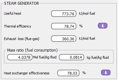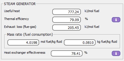 La relación mol comb./kg agua y kg comb./kg agua. Eficiencia del generador de vapor. Eficiencias exergética y térmica de la instalación: