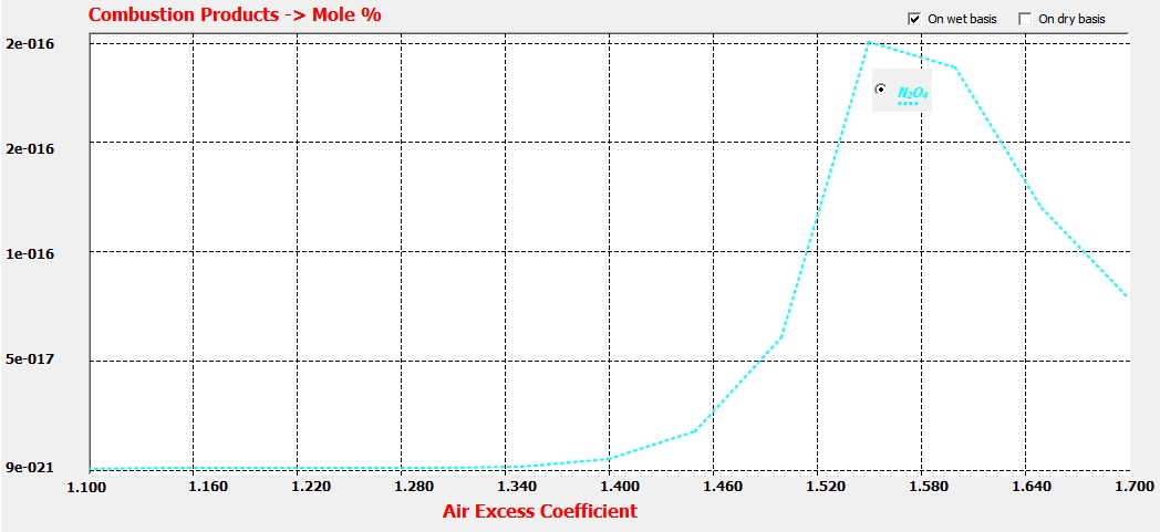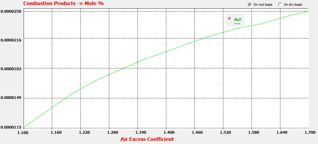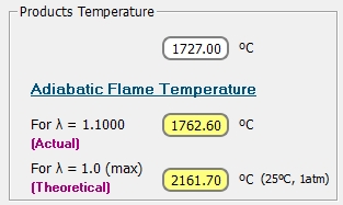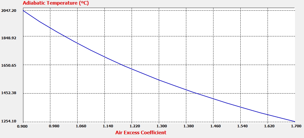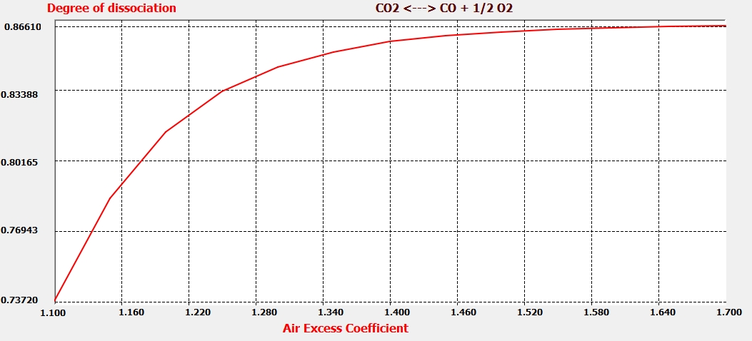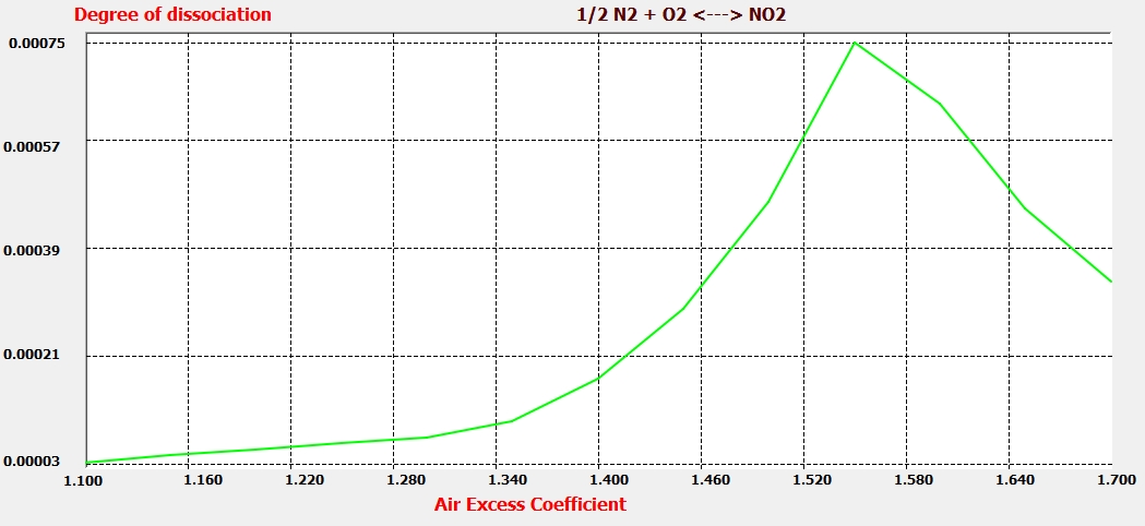 En estas condiciones, al aumentar el coeficiente de exceso de aire, disminuye la temperatura adiabática de la llama, con lo que disminuye la constante de equilibrio, disminuyendo con ello la cantidad de NO generado.