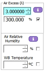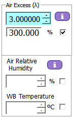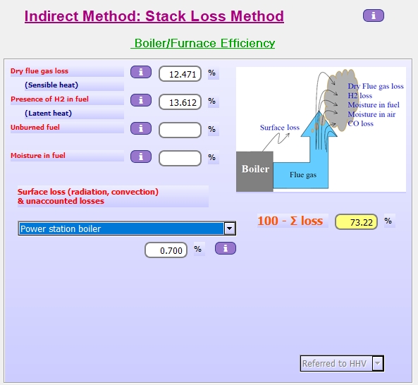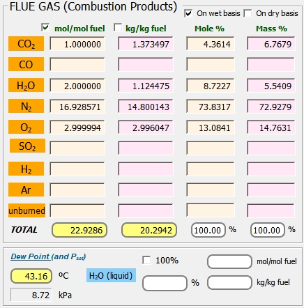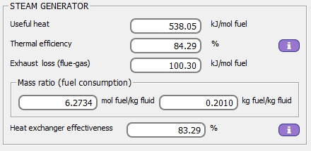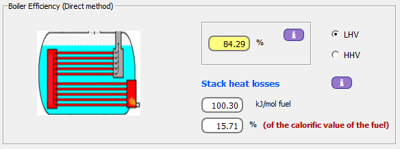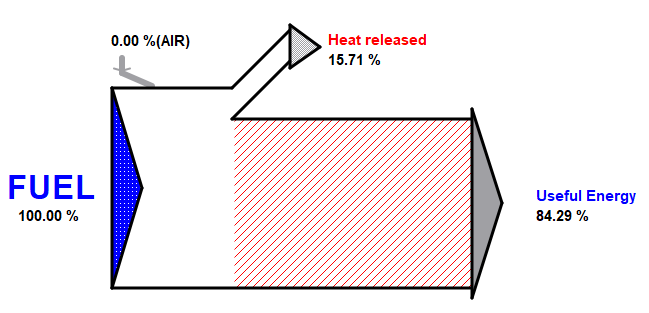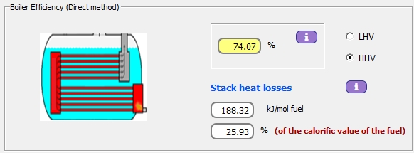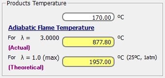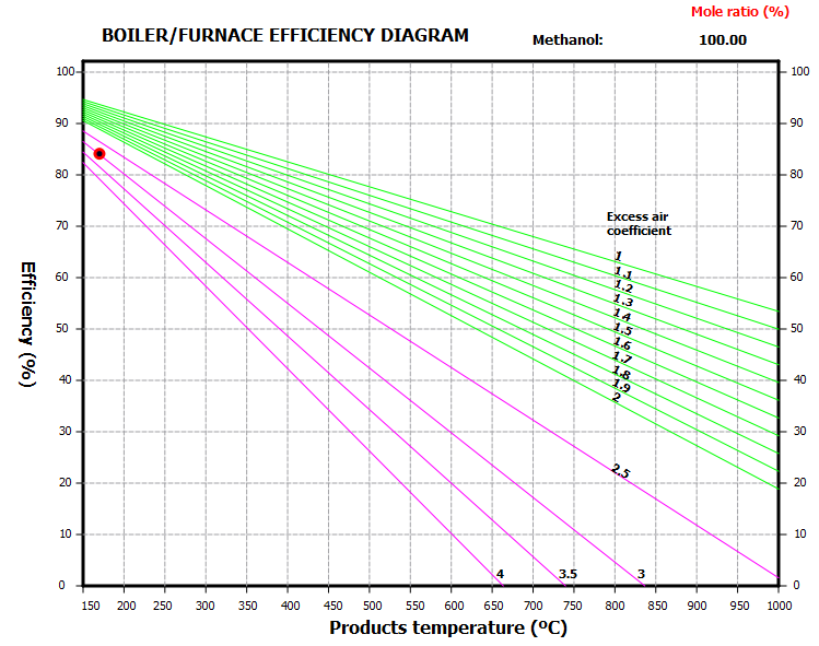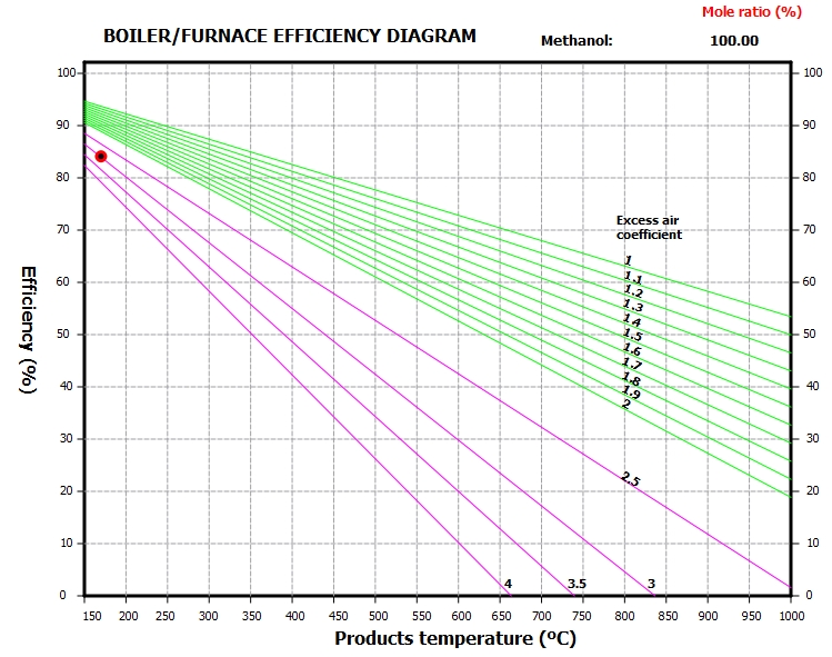 La eficiencia de la combustión de la caldera puede ser graficada en función de la temperatura de los productos de combustión y del coeficiente de aire. En este caso al no haber inquemados, el estado (λ=3, Tp=170ºC) puede ser representado.