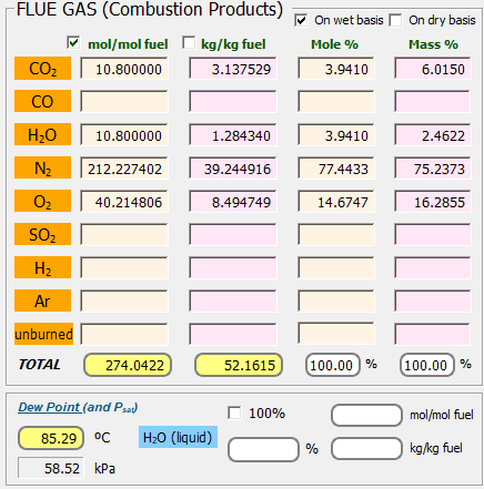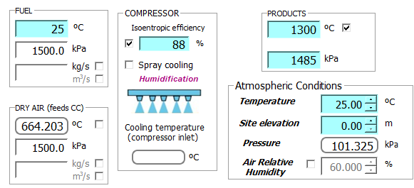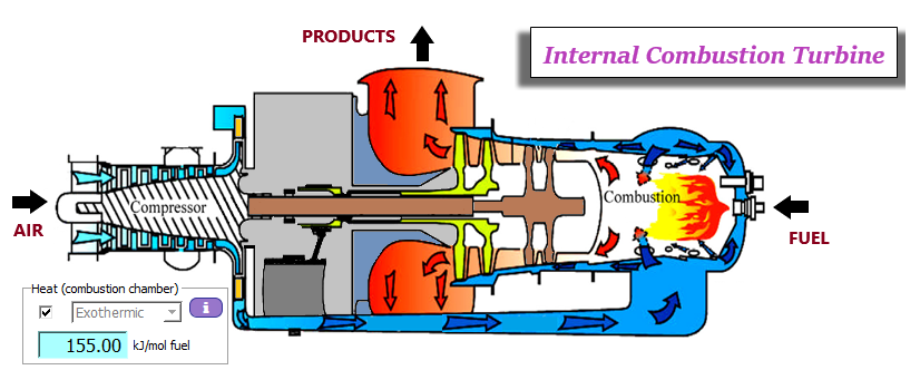 Un ciclo de Brayton regenerativo convencional es empleado como motor de impulsión de un avión. El combustible empleado es A-1 (JP-8). Se conoce el calor cedido en la cámara de combustión 155 kJ/mol fuel. El aire y el combustible entran en condiciones standard, y los productos de combustión salen a 1300 ºC. La alta presión es de 1500 kPa. La eficacia del intercambiador regenerativo es del 75 %. El compresor tiene una eficiencia isoentrópica del 88 %. La temperatura de los gases de combustión una vez expansionados en la TG es de 750 ºC. La pérdida de carga en el lado caliente y en la cámara de combustión es de 15.0 kPa. Determinar: