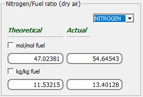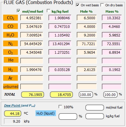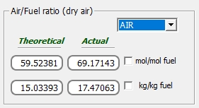 Para tener activa la pestaña del coeficiente de exceso de aire, éste debe ser una variable de entrada, así que hay que comenzar de nuevo el problema, en este caso sin conocer las fracciones molares de los productos. Observe que el problema posee los mismos resultados que en el caso anterior.