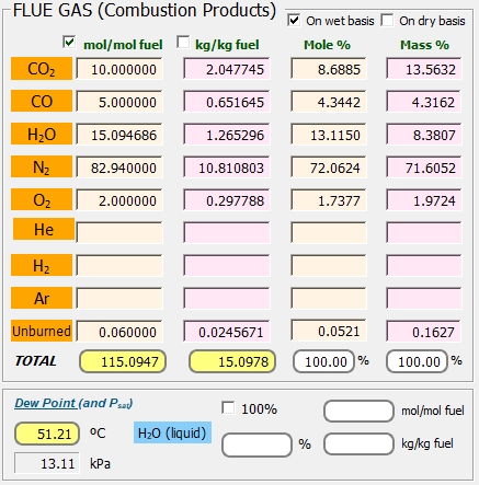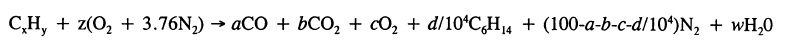 Una forma conveniente de proceder es suponer que un hidrocarburo (CxHy) reacciona con z kmoles de oxígeno para producir 100 kmoles de productos de combustión en base seca, (por supuesto que habrá agua presente en el escape, de modo que nuestra cantidad especificada de reactivos produce más de 100 kmol de productos). En estos cálculos, solo nos ocupamos de relaciones, por lo que cuando evaluamos la relación hidrógeno/carbono, se desconocerá la masa molar media del combustible.