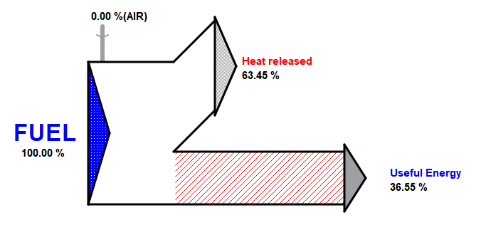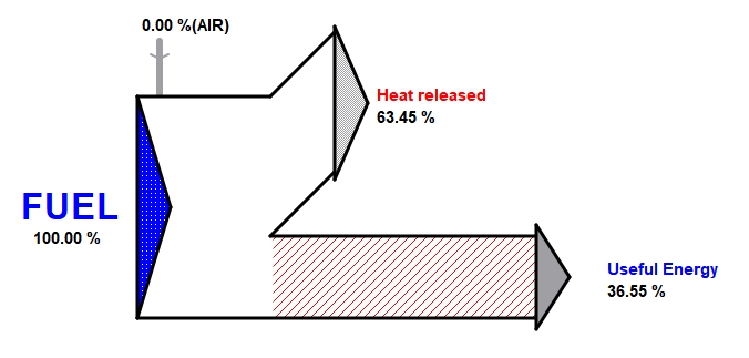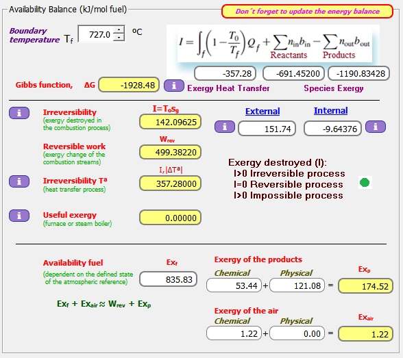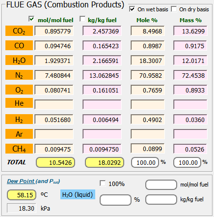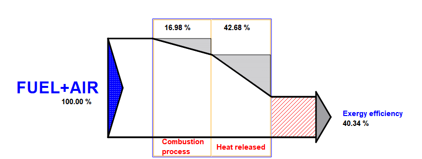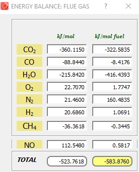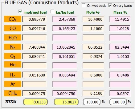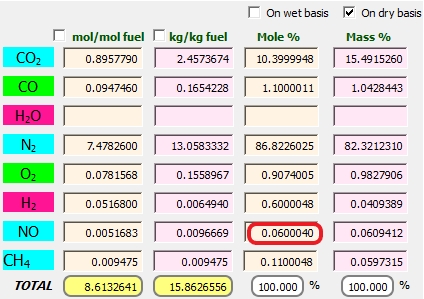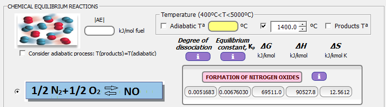 Para tener en cuenta la presencia de NO(g) es necesario recurrir a la disociación química, y modificando la temperatura de equilibrio, podemos ajustar el valor de 600 ppm (0.06%) de NO en base seca (sin presencia de vapor de agua). Este valor se consigue para una temperatura de equilibrio de 1400 ºC.