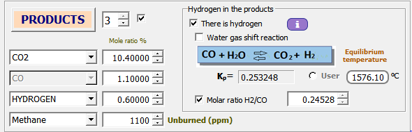 Sabiendo que el consumo específico de combustible es 250 g/kWh. La temperatura de los productos de combustión es 1000 K. Obtener las emisiones de CO, NO e inquemados en g/kWh.