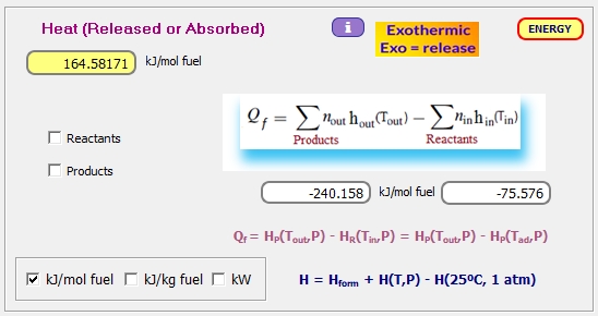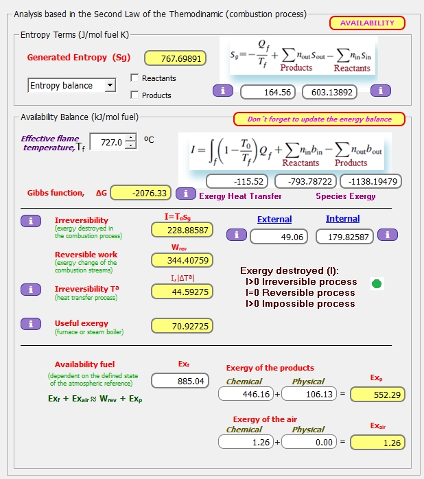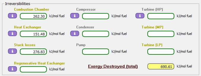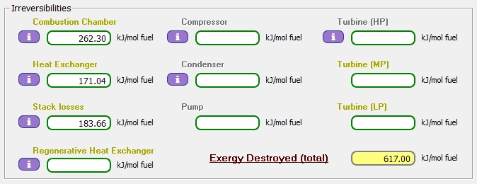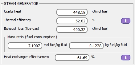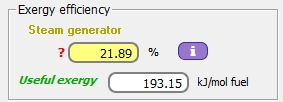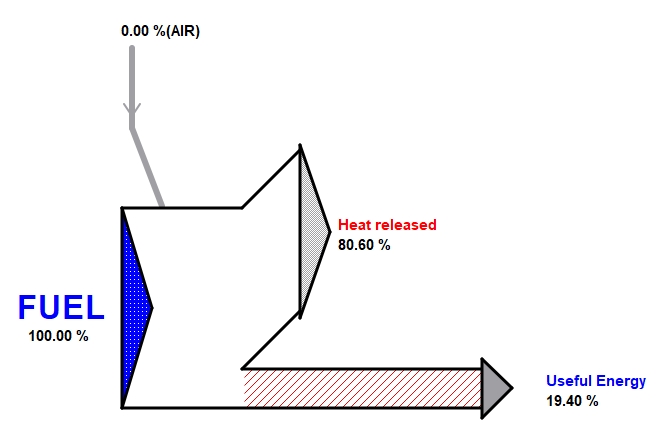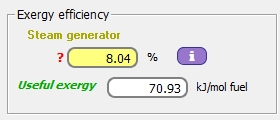 El motivo principal de la baja eficiencia, tanto térmica como exergética, es la baja temperatura alcanzada por los productos de la combustión (trabajando la cámara de combustión adiabáticamente), 964 ºC. El margen de temperatura para generar un calor útil es pequeño (964-600 = 364 ºC), necesitándose 0.0281 kg fuel/kg agua.