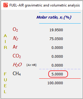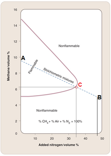 Por lo tanto, cualquier mezcla de metano y aire se encontrará en la línea recta entre el metano puro y el aire puro; esto se muestra como la línea de aire azul (Air line). Los límites superior e inferior de inflamabilidad del metano en el aire se encuentran en esta línea, puntos que cortan con la envolvente de color rojo (en cuyo interior se encuentra la zona inflamable).