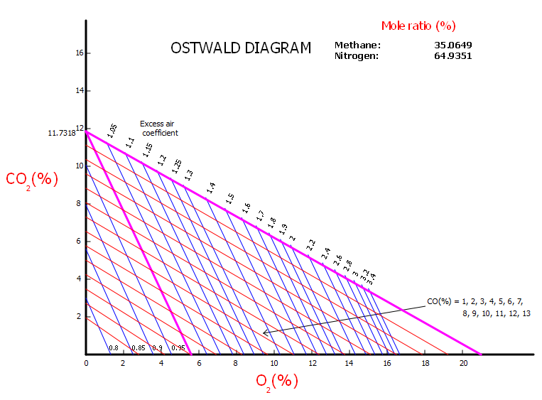 1. De la visualización del diagrama triangular, que muestra todas las mezclas posibles de metano, oxígeno y nitrógeno. El aire es una mezcla de aproximadamente 21% en volumen de oxígeno y 79% en volumen de inertes (nitrógeno).
