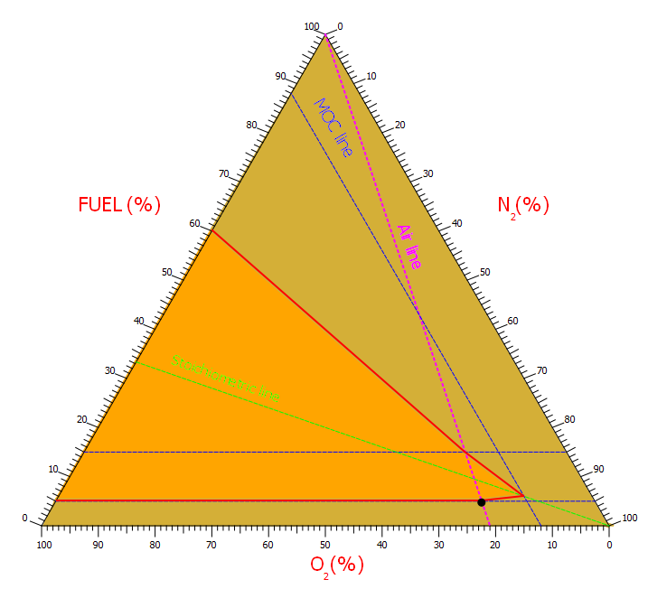 3. La envolvente real que define la zona de inflamabilidad solo puede determinarse en base a experimentos. Ésta atravesará los límites superior e inferior de inflamabilidad del metano en el oxígeno y en el aire. La línea MOC es una paralela al eje del N2 que parte de la concentración límite de oxígeno (LOC, concentración mínima de oxígeno requerida para propagar una llama). En el punto de corte entre las líneas estequiométricas y la línea MOC se encuentra el extremo final de la envolvente de flamabilidad.