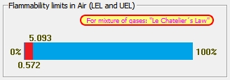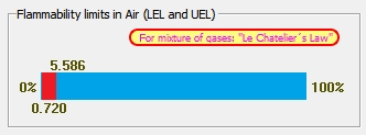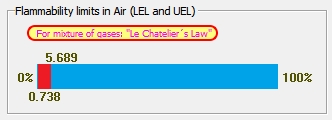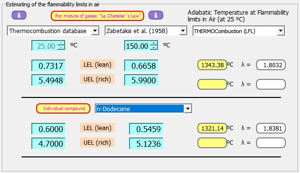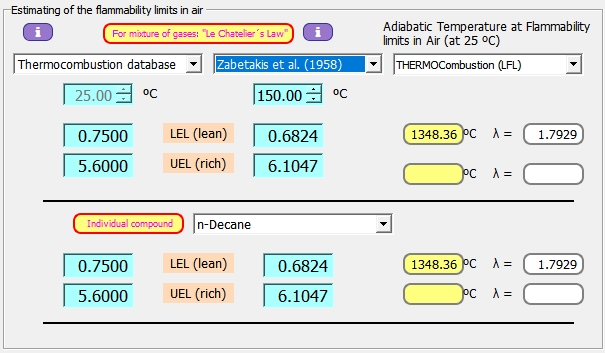Se observa que el aumento de la temperatura, hace más grande el margen de los límites de flamabilidad, decreciendo LEL y aumentando UEL. ThermoCombustion permite el empleo de diferentes formas de obtener estas dependencias, tanto como para la estimación de los límites de inflamabilidad a 25ºC. Para la mezcla de los vapores, se emplea la ley de Le Chatelier.