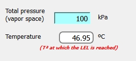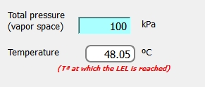 Es fácil verificar empleando el software ThermoProcess, que la presión de saturación del n-decano a 46.95 ºC es 0.738 kPa, por lo que se verifica LFL = Pvapor,i (Tª) / Ptotal