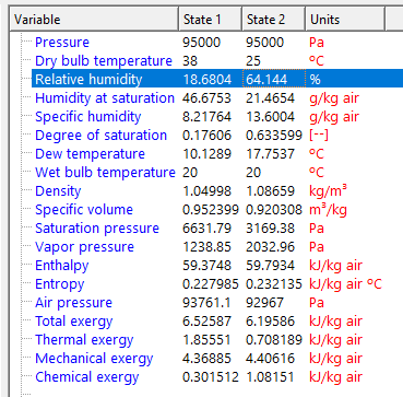 El aire ambiental a 38 °C de temperatura db y 20 °C de temperatura wb ingresa a un enfriador evaporativo con una tasa de flujo másico de aire seco de 0.75 kg/s. La presión es constante a 95 kPa. El aire sale a una temperatura de 25 °C. Calcule: