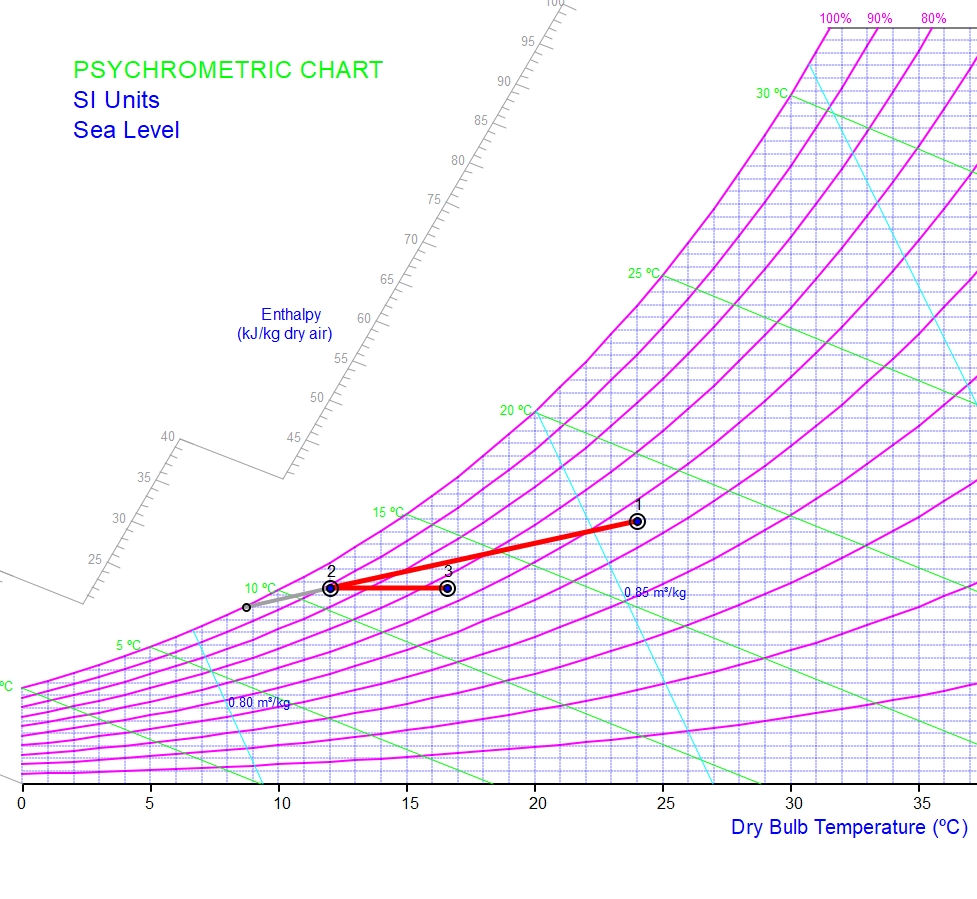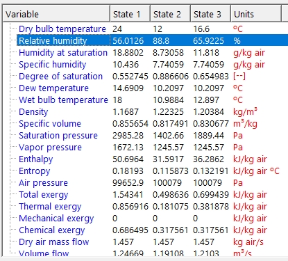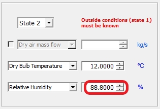 Ajustamos la humedad relativa a la salida de la batería fría, para tener 11 kW de calor latente en la misma.