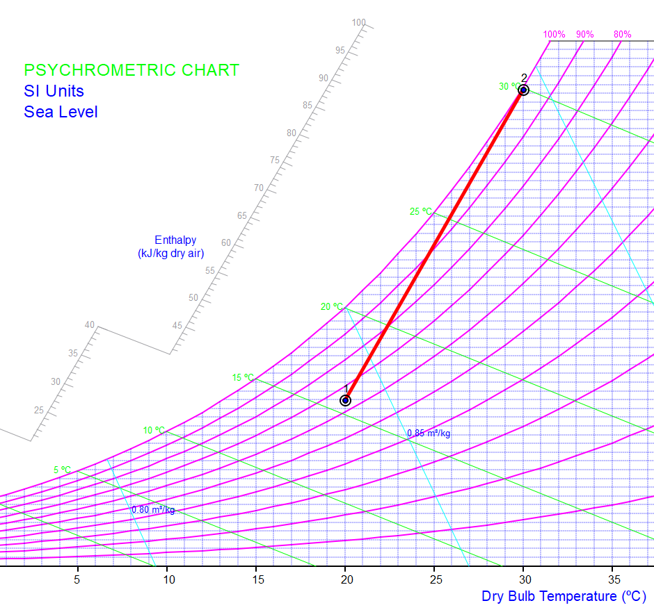 El agua entra a la torre de enfriamiento a 38 °C y sale a 25 °C. El caudal másico de agua es de 24 kg/s. El aire ambiente ingresa a la torre de enfriamiento a 20 °C y 65 % de humedad relativa. El aire sale a 30 °C y 100 % de humedad relativa. La temperatura del agua de reposición es de 24°C. La presión es constante, 101.325 kPa. Calcule: