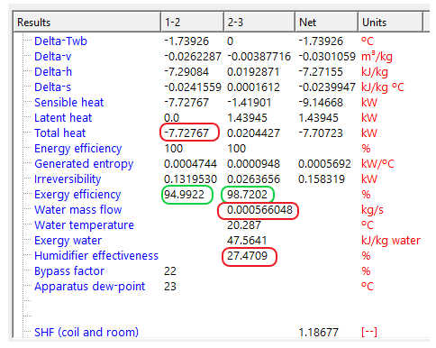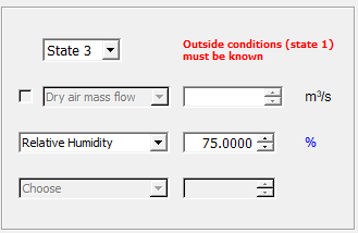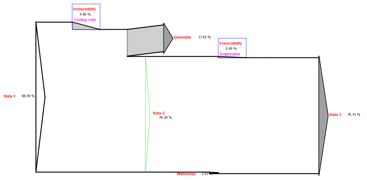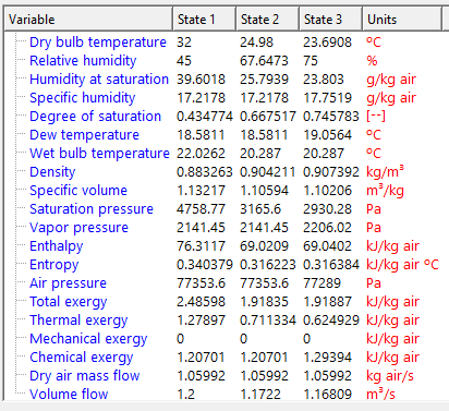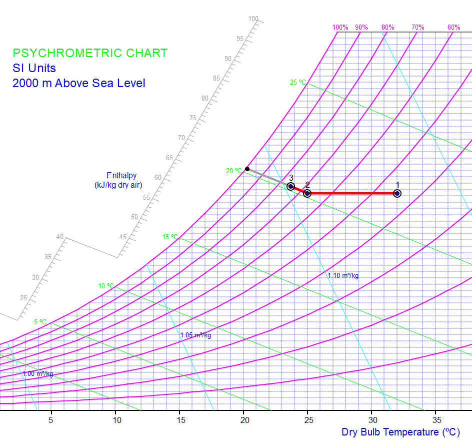 En un enfriamiento evaporativo de dos etapas entra un caudal de 1.2 m³/s de aire húmedo a 32 °C (db) y 45 % de HR a la batería de enfriamiento, posteriormente recorre un enfriamiento evaporativo hasta alcanzar una humedad relativa del 75 %.