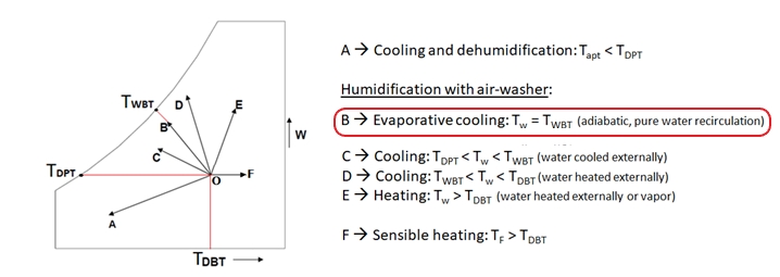 Los climatizadores evaporativos utilizan la evaporación del agua para enfriar el aire. Esta técnica se utiliza en países con climas más cálidos. Se trata de una técnica en extensión. Al pasar el aire caliente por un medio mojado, el agua se evapora y absorbe el calor del aire, lo que hace bajar la temperatura del aire. Para compensar esta pérdida de temperatura del aire, estos sistemas suelen ir acompañados por un calentamiento antes, o después del propio enfriamiento evaporativo.