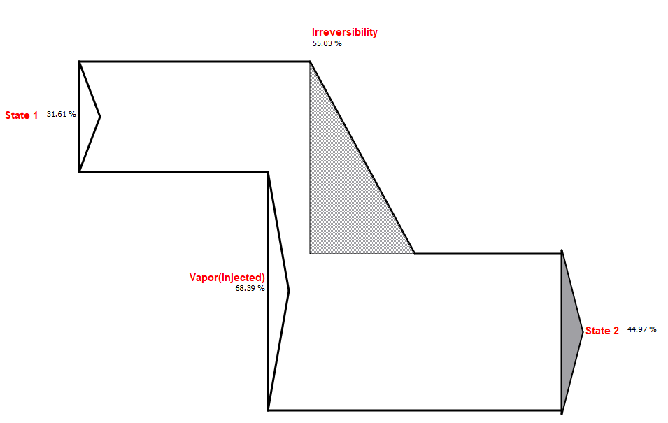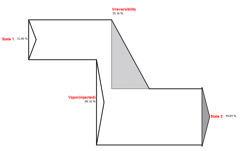 Al inyectar vapor de agua se consigue simultáneamente, un calentamiento y una humidificación, el proceso de aumentar simultáneamente la temperatura del bulbo seco y la relación de humedad del aire. El calor total ganado al pasar de la condición inicial a la final se puede dividir en parte debido al calor sensible y el resto al calor latente. Para separar la entalpía total en calor sensible y latente, considere un movimiento horizontal en la tabla como calor sensible y un movimiento vertical como calor latente. La relación de humedad es constante para el movimiento horizontal (sensible) y la temperatura del bulbo seco es constante para el movimiento vertical (latente).