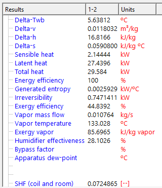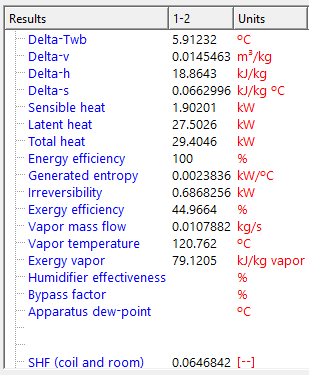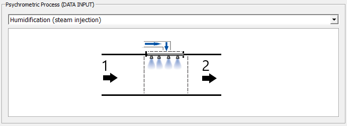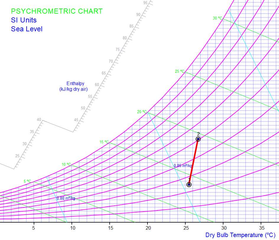 En la tabla psicrométrica, este proceso se muestra como una línea inclinada hacia arriba y hacia la derecha (proceso 1-2). La calefacción y la humidificación del aire se considera mejor observando los dos procesos secuencialmente. El primero, del estado 1 al estado 0, es el calentamiento sensible que ocurre cuando el aire pasa a través del intercambiador de calor. El segundo, del estado 0 al estado 2, es el proceso de humidificación.