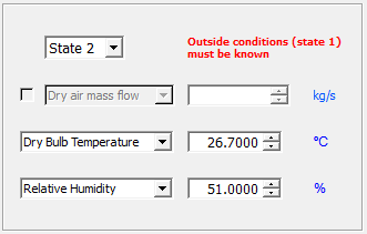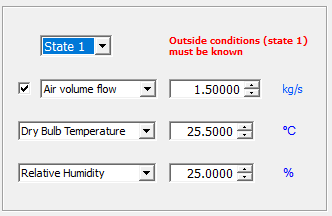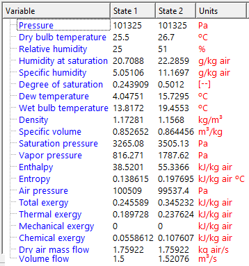 Un caudal de 1.5 m³/s entra en un humidificador (con vapor de agua) a 25.5 °C y 25 % de humedad relativa. La salida se produce a 26.7 °C y una humedad relativa del 51 %.