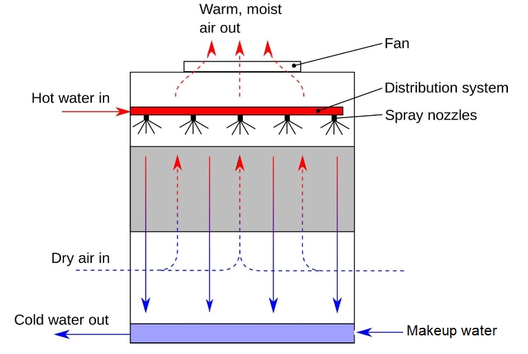 Una torre de enfriamiento es un dispositivo de eliminación de calor que utiliza agua para transferir el calor residual del proceso a la atmósfera. Asimismo, una torre de refrigeración industrial funciona según el principio de eliminar el calor del agua mediante la evaporación de una pequeña porción de agua que se recircula a través de la unidad. La mezcla de agua tibia y aire más frío libera calor latente de vaporización, lo que hace que el agua se enfríe.