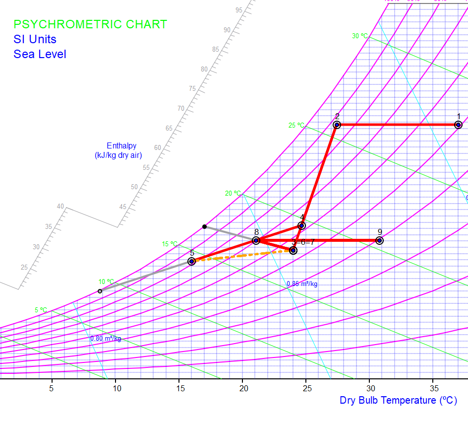Asumiendo que el porcentaje de aire recirculado es del 80 %, que la diferencia de temperatura entre el aire de impulsión y el recirculado es de 8 °C, y que la eficiencia del recuperador de calor es del 60 %.