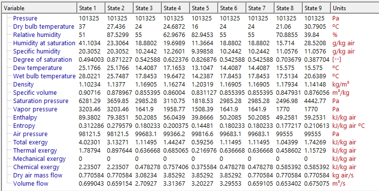 Se recogen las irrversibilidades en la Unidad de Tratamiento Aire (UTA), y la eficiencia exergética de cada equipo. También se muestra la eficiencia global de la UTA, siendo las entradas los estados "1" (aire exterior) y "6" el aire recirculado proveniente del espacio a climatizar.