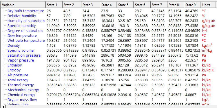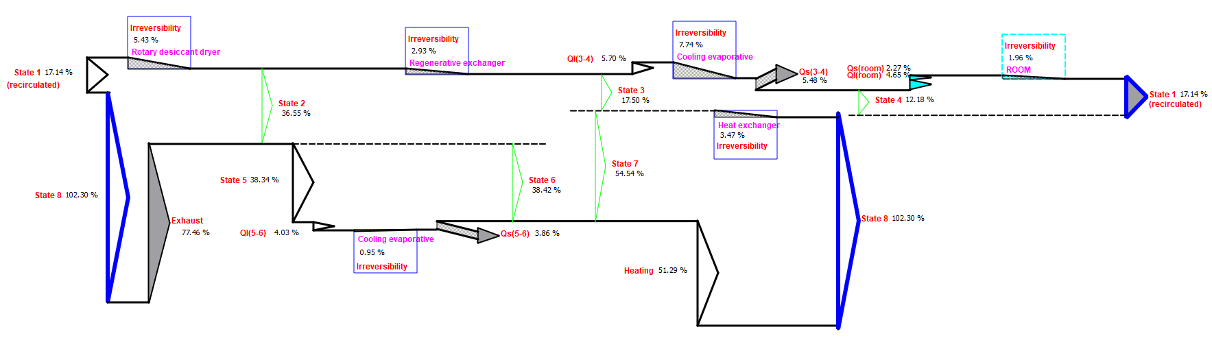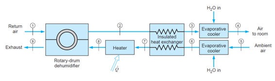 Una unidad de adsorción, ciclo de recirculación, es empleada como unidad de climatización empleando refrigeración evaporativa pulverización de agua y deshumidificación. Esta deshumidificación se consigue, como como se muestra en la figura, usando un material desecante, que absorbe agua en un lado de un intercambiador rotatorio de tambor. El desecante se regenera calentando en el otro lado del tambor para conducir el agua fuera. La presión total es de 100 kPa en todas partes, y las propiedades están en el diagrama de la instalación.