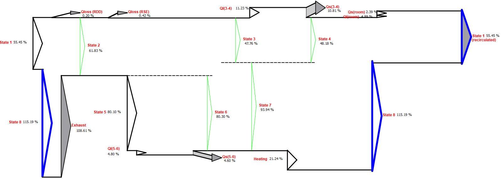 El ciclo de recirculación es el mismo que el ciclo de ventilación, con el aire procesado cambiado de aire ambiente a aire de retorno y el cambiador de aire de regeneración de aire de retorno a aire ambiente. Los procesos recorridos por el aire se muestran en la figura.
