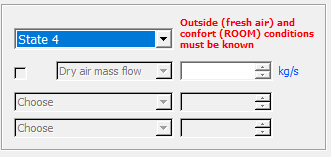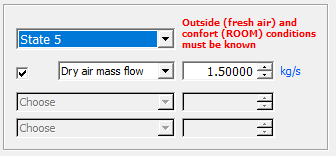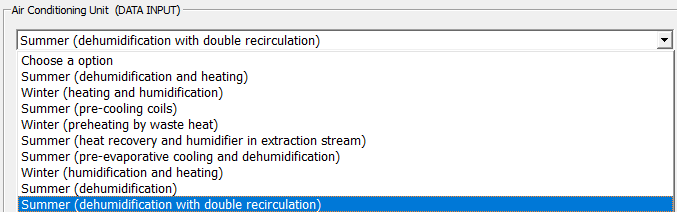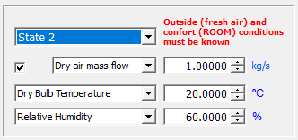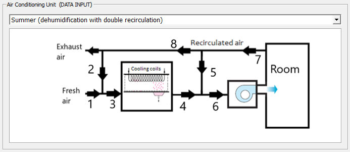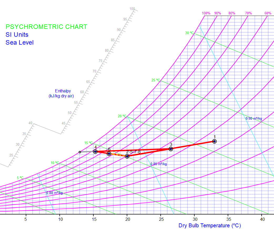 El sistema de la figura es una instalación de una unidad de aire acondicionado, con un equipo de deshumidificación y enfriamiento, y unas vías de recirculación del aire. La temperatura del bulbo seco (db) del espacio se mantiene a 20 °C y una humedad relativa del 60%. El caudal másico de aire seco del aire de impulsado es de 3.5 kg/s. El aire de ventilación exterior a una temperatura de 33 °C (db) y una humedad relativa del 35 % se introduce en el sistema a razón de 1 kg de aire seco/s. El caudal de aire de recirculación por "2c" es de 1 kg/s. La presión es constante a 101.325 kPa.
