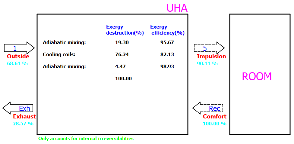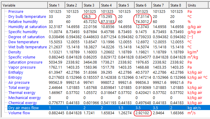 La capacidad de refrigeración del sistema es 25.0832 kW, de los que 5.96707 kW se emplean en el espacio a refrigerar y el resto (19.1161 kW) se pierde en la renovación del aire de ventilación del exterior.